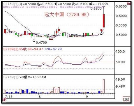 今日开盘,远大股价高开高走,股价一度高见0.65港元,涨幅高达22%。并一跃成为今日港股涨幅至最。开盘仅一小时,成交量已激增至昨日全日之六倍。爆发力相当惊人。