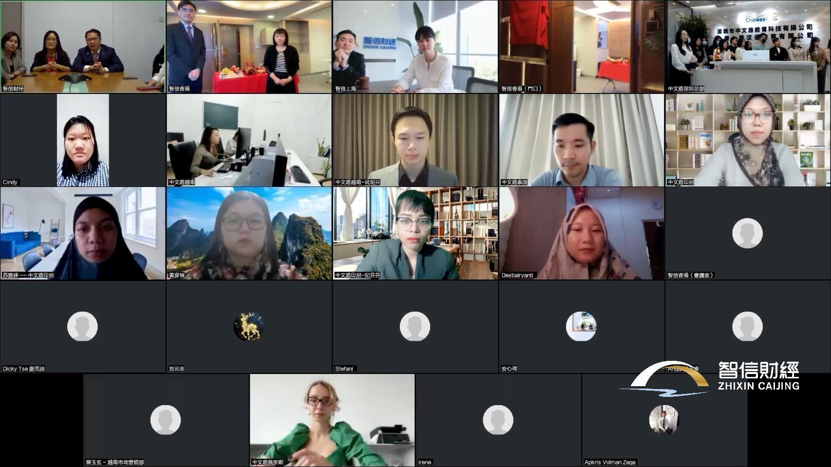 智信财经董事长郭信麟先生、执行董事陈宇虹女士、总裁蔡敏玉女士、上海分公司总经理刘云志先生,携集团深圳总部、上海分公司的各位同事,与中文路深圳总部,以及中文路越南、印尼、泰国、俄罗斯等多地分公司的同事一道,通过视频连线的方式共同见证了这一重要时刻。