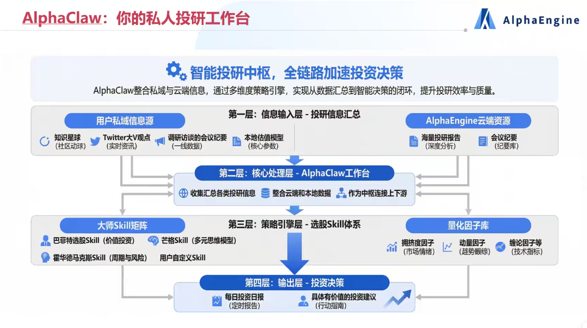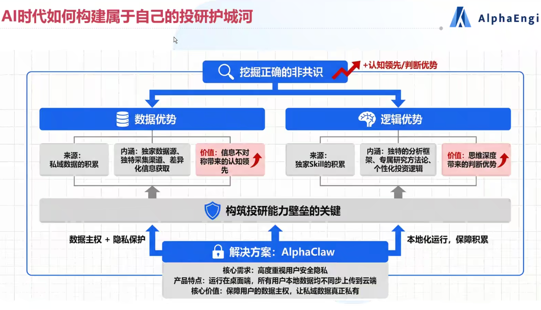 熵简科技合伙人Ada围绕AI投研的“龙虾助手”——AlphaClaw展开分享,探讨人工智能在投资研究领域的创新应用,结合投研会已经使用的AI投研利器AlphaEngine,以后将有自己的AI研究员和AI基金经理,在此基础上搭建自己的数据优势和逻辑优势。现场熵简科技还给大家分发了AlphaClaw 积分赠送的小卡片,现在投研会成员扫码和他们的客户联系试用,即可获赠几千初始积分 AlphaClaw。AlphaClaw 搭载于 AlphaEngine 产品,登录 官网 下载 AlphaEngine 桌面端应用,打开即可体验 AlphaClaw 小龙虾功能。